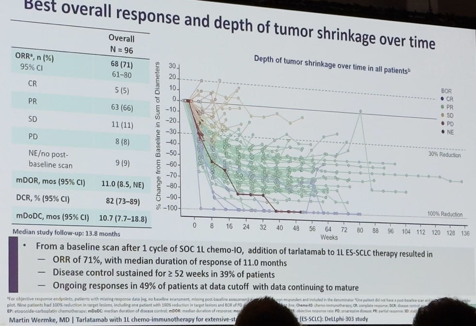 在2025年ESMO大会上,研究者报告了Ib期DeLLphi-303研究第2、4和7部分的安全性和疗效结果,这些部分探索了Tarlatamab联合一线化疗免疫治疗,随后Tarlatamab联合PD-L1维持治疗在ES-SCLC患者中的应用。