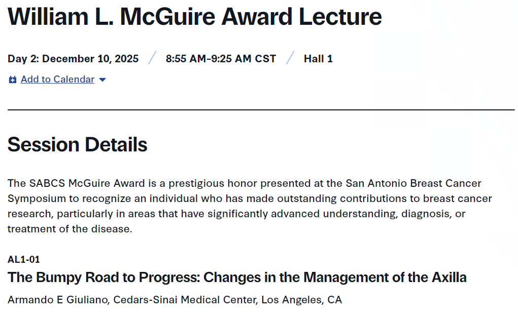 2025年圣安东尼奥乳腺癌研讨会(SABCS 2025)将于2025年12月9日-12日,在德克萨斯州圣安东尼奥市的Henry B.Gonzalez Convention Center举行。Armando E Giuliano医学博士将在2025年SABCS期间,被授予McGuire Award纪念讲座奖。