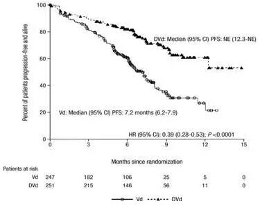 在CASTOR研究中,共纳入498例接受≥1个一线治疗的MM患者,按1:1的比例随机分为DVd组(n=251)和Vd组(n=247),接受8个疗程的治疗。无进展生存(PFS)为主要观察终点。所有患者入组前均接受至少2种或以上的一线治疗方案。其中,66%的受试者曾接受过硼替佐米治疗,76%曾使用过免疫调节剂(IMiD),48%接受过蛋白酶体抑制剂(PI)和IMiD的联合方案,此外还有32%的患者对目前三线或四线治疗方案耐药。