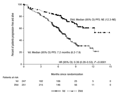在CASTOR研究中,共纳入498例接受≥1个一线治疗的MM患者,按1:1的比例随机分为DVd组(n=251)和Vd组(n=247),接受8个疗程的治疗。无进展生存(PFS)为主要观察终点。所有患者入组前均接受至少2种或以上的一线治疗方案。其中,66%的受试者曾接受过Bortezomib治疗,76%曾使用过免疫调节剂,48%接受过蛋白酶体抑制剂和免疫调节剂的联合方案,此外还有32%的患者对目前三线或四线治疗方案耐药。