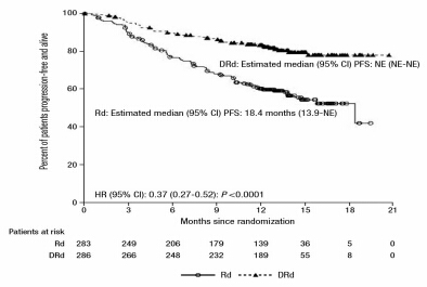 该研究共纳入569例接受一线以上治疗的RRMM患者,中位年龄65岁,按照1:1比例随机接受Daratumumab联合Lenalidomide/Dexamethasone(DRD)或Lenalidomide/Dexamethasone(RD)治疗。其中,Lenalidomide 25 mg(第1~21天,每28天1疗程);Dexamethasone 40 mg(每周一次);Daratumumab 16 mg/kg(每周1次,共8周,接着每2周1次,共16周,随后每4周1次,直到疾病进展)。主要研究终点为PFS,次要研究终点为TTP、ORR、VGPR及安全性等。