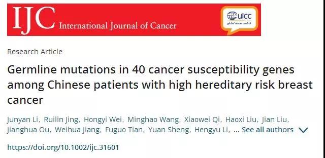 IJC丨中国高风险遗传性乳腺癌患者40个癌症易感基因种系突变