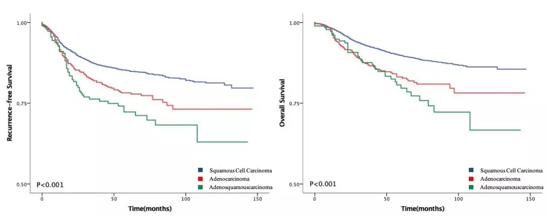 图1.不同病理类型患者的RFS及OS 曲线。(Squamous cell carcinoma鳞癌;adenocarcinoma 腺癌;Adenosquamous carcinoma 腺鳞癌)
