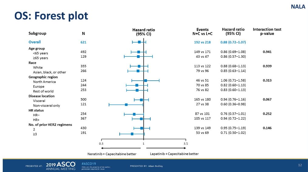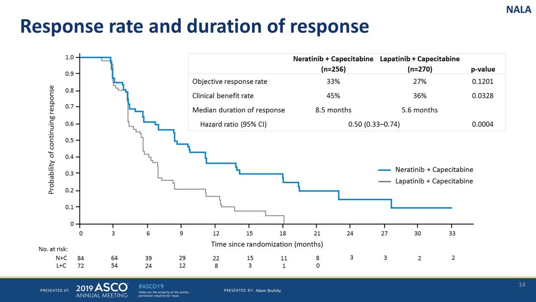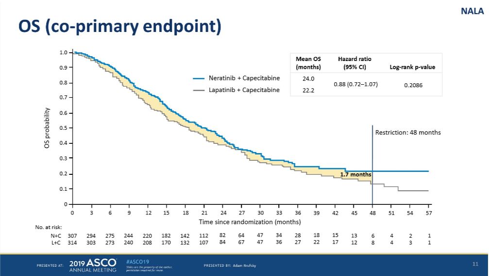 NALA试验对621名妇女随机分为来那替尼+卡培他滨组和拉帕替尼+卡培他滨组,并对她们的疾病进展和生存率进行跟踪随访。试验结果是阳性的,风险比为0.76,这意味着这些妇女的无进展生存要相对提高25%。试验结果显示(来那替尼+卡培他滨组患者)获得平均2.2个月生存改善,具有统计学意义。来那替尼+卡培他滨的应答持续时间为8.5个月,而拉帕替尼+卡培他滨的应答持续时间为5.6个月。所以这也是很好的。有趣的是,总生存期有1.8个月的绝对获益,来那替尼+卡培他滨对比拉帕替尼+卡培他滨的OS分别为24.0个月和22.2个月。这真的是非常大的进步。