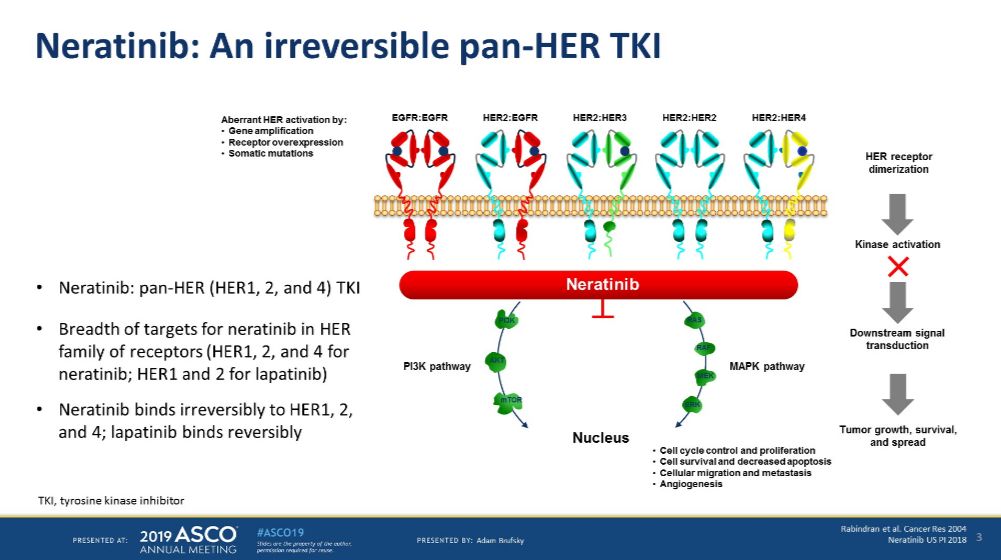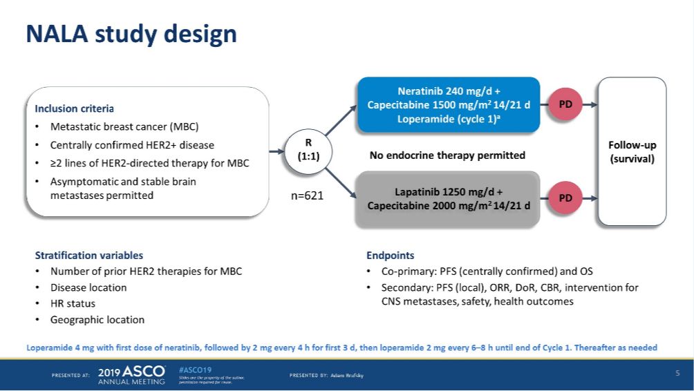 AdamBrufsky:对于晚期HER2阳性转移性乳腺癌的后线治疗,我们一直没有很好的治疗方法。我们有曲妥珠单抗、帕妥珠单抗以及T-DM1。但是我们真的不知道在患者接受这些治疗进展后该怎么做。长期以来,拉帕替尼和卡培他滨的联合用药一直是治疗的标准之一。NALA试验的主要目的是对比来那替尼+卡培他滨和拉帕替尼+卡培他滨。我们知道来那替尼是一种不可逆的泛HER结合物,而拉帕替尼是可逆的。