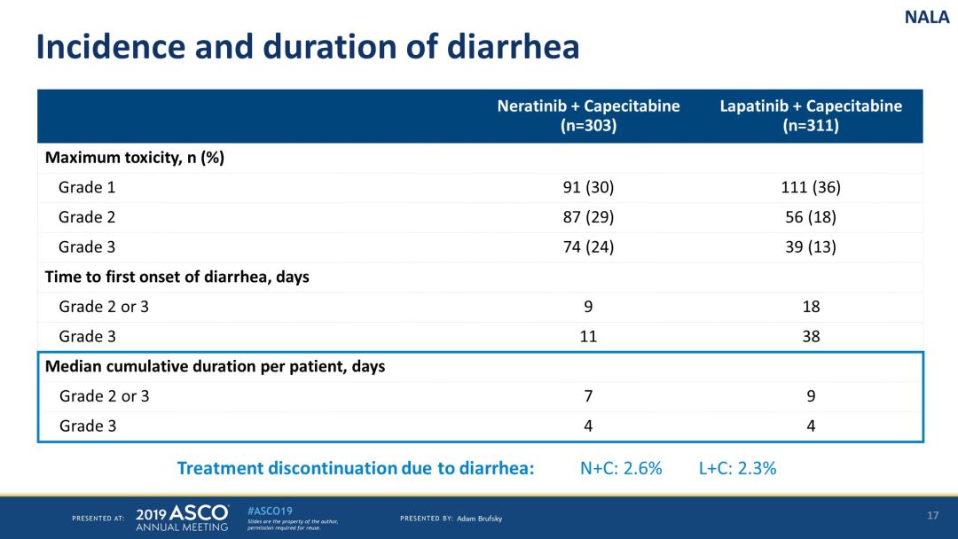 AdamBrufsky:这很有趣。尽管有超过20%的3级腹泻患者是由来那替尼+卡培他滨引起的,但这是非常有限的。3级腹泻的中位时间为4天。所以,如果每个人都预防应用了洛哌丁胺,患者的预防措施得当,则只有3到4天的3级腹泻。所以这真的很好。事实证明,我们知道这一点,因为在试验过程中患者的生活质量没有改变。所以(来那替尼+卡培他滨在药物安全性方面)它是优越的,只有2%或2.5%的病人因为腹泻而不得不退出试验。因此,即使人们知道这种药物会导致腹泻,但真正的预防措施是可以控制的,并且不会影响患者的生活质量。