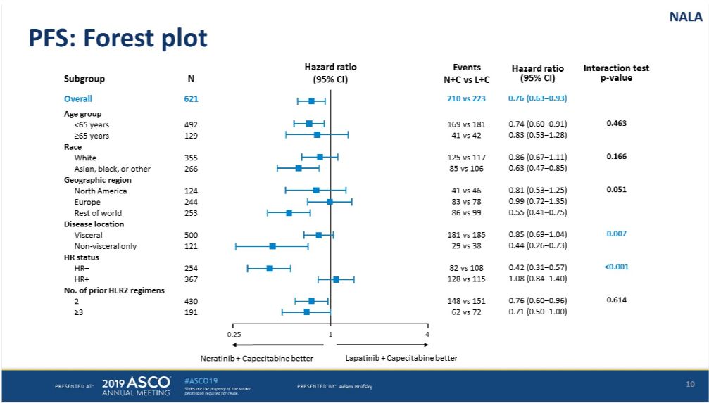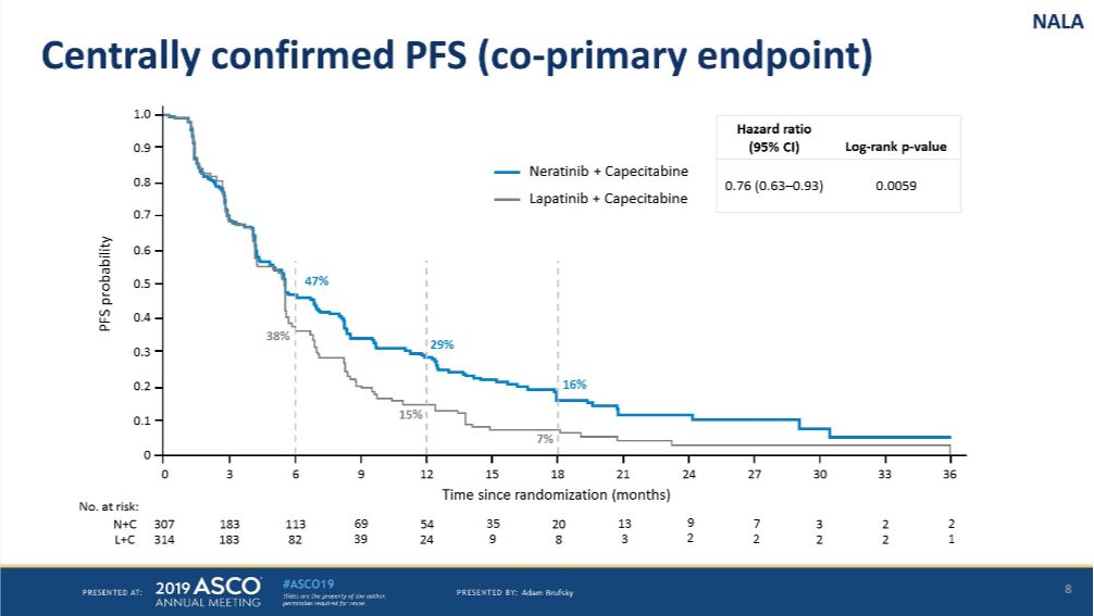 背景:NALA(clinicaltrials.govnct01808573)是一项国际多中心、随机开放标签的3期试验,治疗方案为来那替尼(一种不可逆的泛HER酪氨酸激酶抑制剂)+卡培他滨(N+C)vs拉帕替尼+卡培他滨(L+C),试验对象为已接受过2次以上抗HER2方案的HER2阳性转移性乳腺癌患者。