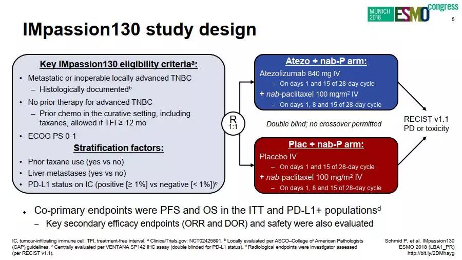 马飞教授:IMpassion130是乳腺癌免疫治疗领域开展的一项重要的多中心临床研究,这项研究目前取得了比较好的结果,也可以说是我们在三阴性乳腺癌或者整个乳腺癌治疗领域取得的一个突破性的进展。该研究入组了902例不可手术的局部晚期或者转移性乳腺癌患者,1:1随机接受一线阿特利珠单抗联合白蛋白紫杉醇治疗对比安慰剂联合白蛋白紫杉醇治疗,主要研究终点包括PFS和OS。