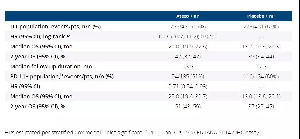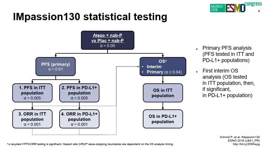 此项研究的特殊性在于它的统计学设计,它平行检验了ITT人群和PD-L1阳性这两组人群的PFS的水平。而对于OS是按层级进行检验,先检验ITT人群,获得阳性结果后再针对其中PD-L1阳性人群的OS数据进行进一步分析。这样的检验方法优点在于很大程度上能减少对p值的消耗,控制样本量,增加研究进度。伴随的风险就是,如果首先检验的ITT人群没有统计学差异,后续的PD-L1阳性人群就无法正式检验。但是此研究设计巧妙,对临床研究有一定的促进作用。