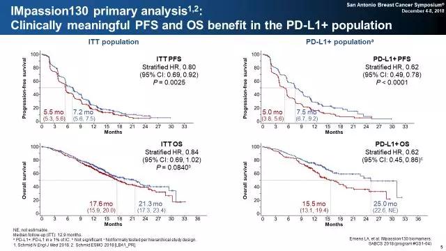 马飞教授:众所周知,IMpassion130的研究结果显示在ITT人群中,实验组和对照组的PFS分别为7.2个月和5.5个月;而在PD-L1阳性的患者群体中,PFS的差异更明显,实验组和对照组的PFS分别为7.5个月和5.0个月,而且都有显著的统计学差异,所以说患者PFS的获益是非常明确的。之所以研究设计不先检验PD-L1+人群是因为在IMpassion130之前,阿替利珠单抗只有两个Ⅰ期研究,其中与白蛋白紫杉醇联合治疗的GP28328研究只有32例三阴性乳腺癌患者,信息量相对较少,还无法真正判断PD-L1对免疫治疗的指导意义,而且PD-L1人群的比例只有40%多一点,基于样本量的原因,先检验PD-L1人群同样要冒很大的风险。所以在最初设计的时,我们还是先以ITT人群作为一个主要研究终点。