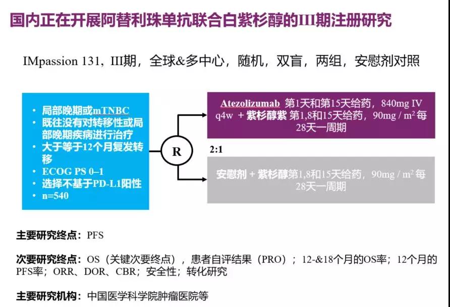 马飞教授:IMpassion130研究取得巨大成功以后,不但在医生群体引起了轰动,在乳腺癌患者里也引起了极大的一个反响,很多晚期三阴性患者来咨询该药对中国患者可及性的问题。为了加快阿替利珠单抗在中国临床的可及性,我们目前正在开展IMpassion131研究,研究的设计主要是针对中国晚期三阴性乳腺癌患者的一线治疗,我们在最常用的化疗药物就是溶剂型紫杉醇的基础上联合了PD-L1单抗。我们有前期IMpassion130的结果,对于不可手术的局部晚期或者转移性乳腺癌患者以2:1的比例随机接受一线阿替利珠单抗联合紫杉醇对比安慰剂联合紫杉醇治疗,大部分的患者是可以获得化疗联合免疫治疗的。