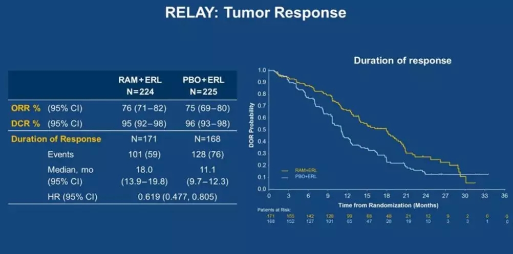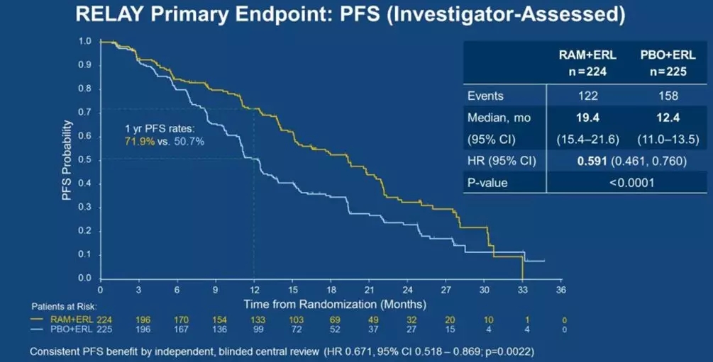 林根教授首先介绍了III期RELAY试验的结果,EGFR阳性非小细胞肺癌患者一线治疗,对比厄洛替尼单药,厄洛替尼联合ramucirumab(雷莫芦单抗)降低了40%以上的疾病进展或死亡风险。