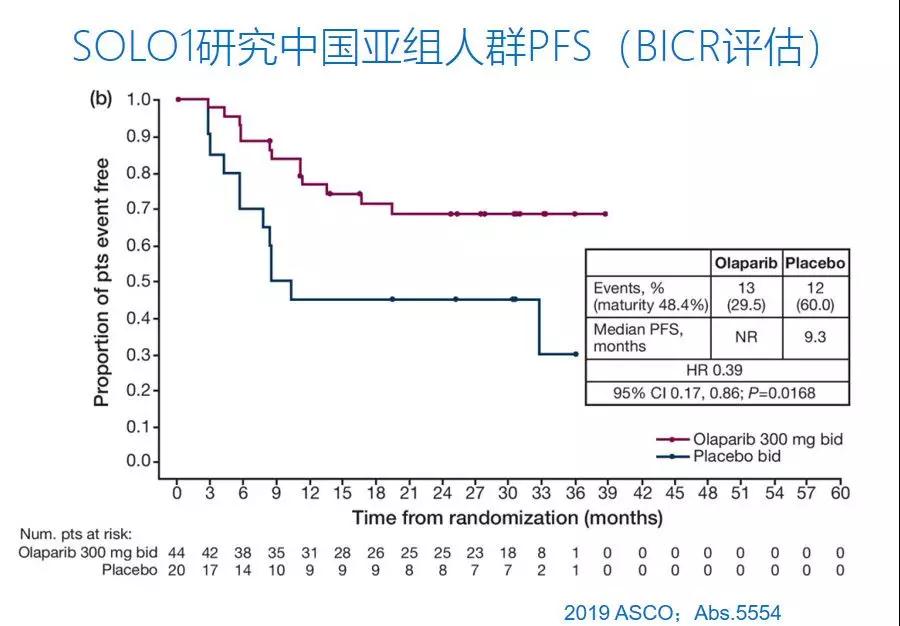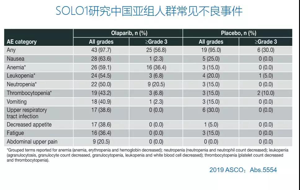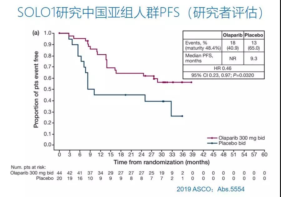 2019年ASCO大会进一步报道了SOLO1研究的亚组分析和中国人群数据。在64人的中国亚组分析中,中位随访30个月时,安慰剂组(n=20)中位PFS为9.3个月,试验组(n=44)仍未达到。目前看来,中国人群的生存获益与SOLO1全球数据基本一致,且安全性方面数据也相似。