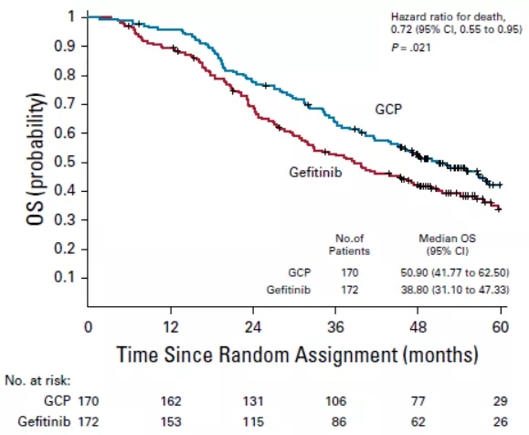 疾病进展后,吉非替尼单药组有77.4%的患者接受了铂类药物为基础的治疗,单药组和联合组分别有23.3%和21.8%的患者在后续治疗过程中接受了奥希替尼治疗。两组中位生存时间分别为50.9个月和38.8个月(HR=0.72, 95% CI: 0.55-0.95, P=0.021)(图4)。