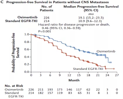 FLAURA研究的PFS(1a)、有CNS转移(1b)和无CNS转移(1c)患者的PFS