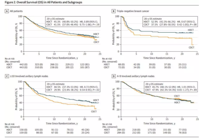 结果显示HDCT组和CDCT组患者的20年OS率分别为45.3%和41.5%(HR 0.89;95%CI,0.75~1.06)。其中,三阴性乳腺癌以及存在10枚以上腋窝淋巴结转移的患者,20年OS率均有显著改善,两者绝对改善分别为15.4%(HR 0.67,95% CI 0.42~1.05)和14.6%(HR 0.72;95% CI 0.4~0.95)。两个治疗组在20年内第二恶性肿瘤或主要心血管事件的累积发病风险相似(HDCT组第二恶性肿瘤的20年累积发病风险为12.1%,CDCT组为16.2%,P=0.10),尽管HDCT组的患者更常患有高血压(21.7% vs 14.3%,P=0.02),高胆固醇血症(15.7% vs 10.6%,P=0.04),心律失常(8.6% vs 4.6%,P=0.005)。