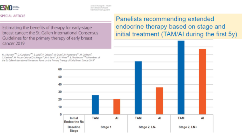对于内分泌治疗多数专家认同做升阶梯的治疗。2019年St.Gallen专家共识中多数专家推荐根据肿瘤分期和初始5年的内分泌治疗(TAM/AI)方案综合判断,以决定是否有必要进行延长内分泌治疗。