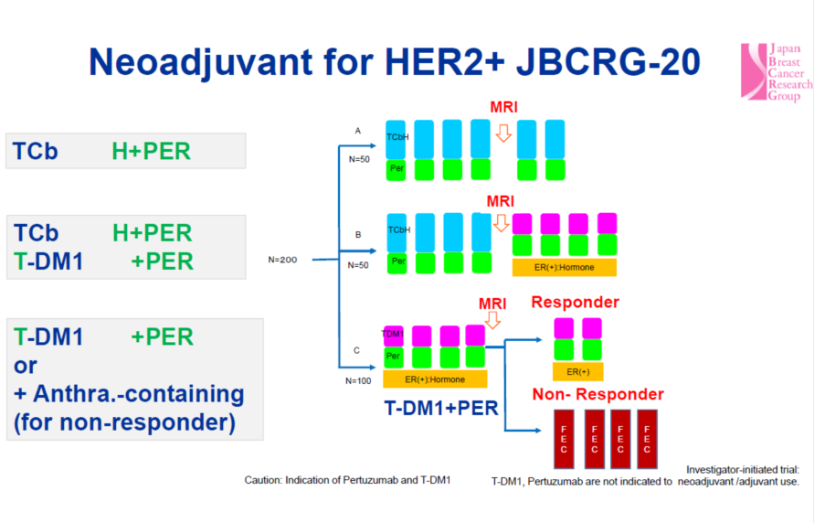为探讨HER2阳性乳腺癌新辅助治疗中T-DM1 联合帕妥珠单抗的疗效与安全性,日本乳腺癌研究组发起了JBCRG-20研究,旨在寻找增加pCR率并减小毒性的新辅助靶向个体化治疗方案。研究分为三组,第一组(对照组)为TCbHP六周期;第二组为四周期TCbHP序贯四周期T-DM1+P;第三组初始四周期T-DM1+P后根据MRI评价疗效,反应组继续T-DM1+P至六周期,无反应组改为CEF四周期。主要研究终点为pCR率。研究结果显示,TCbHP六周期的新辅助治疗在ER-组取得了与TRYPHAENA研究相似的pCR率(ypT0/is ypN0)。让人意外的是,第二组在ER+者中取得了非常好的pCR率。而第三组中如果我们针对肿瘤的反应个体化调整方案,继续给予2周期T-DM1+P,ER+与ER-者均取得了不错的疗效和更少的毒性。