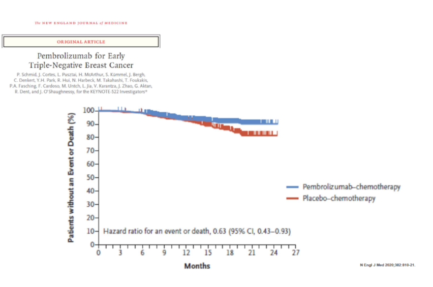 免疫治疗药物PD-1抑制剂pembrolizumab在早期TNBC患者的治疗中具有良好的抗肿瘤活性和安全性。今年《新英格兰医学杂志》在线发表的KEYNOTE-522研究分析了在新辅助化疗中加入pembrolizumab对早期TNBC患者pCR的改善作用。结果显示在铂类新辅助化疗中添加pembrolizumab可使病理完全缓解率pCR(ypT0/Tis ypN0)提高13.6%,结合术后辅助治疗,死亡风险降低37%。具体哪些确切的Biomarker能够提示免疫治疗有效,TNBC新辅助治疗后non-pCR患者的后续强化升阶梯治疗仍然值得进一步探讨。