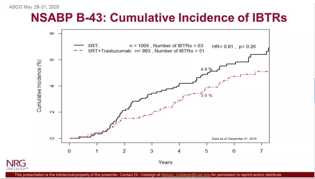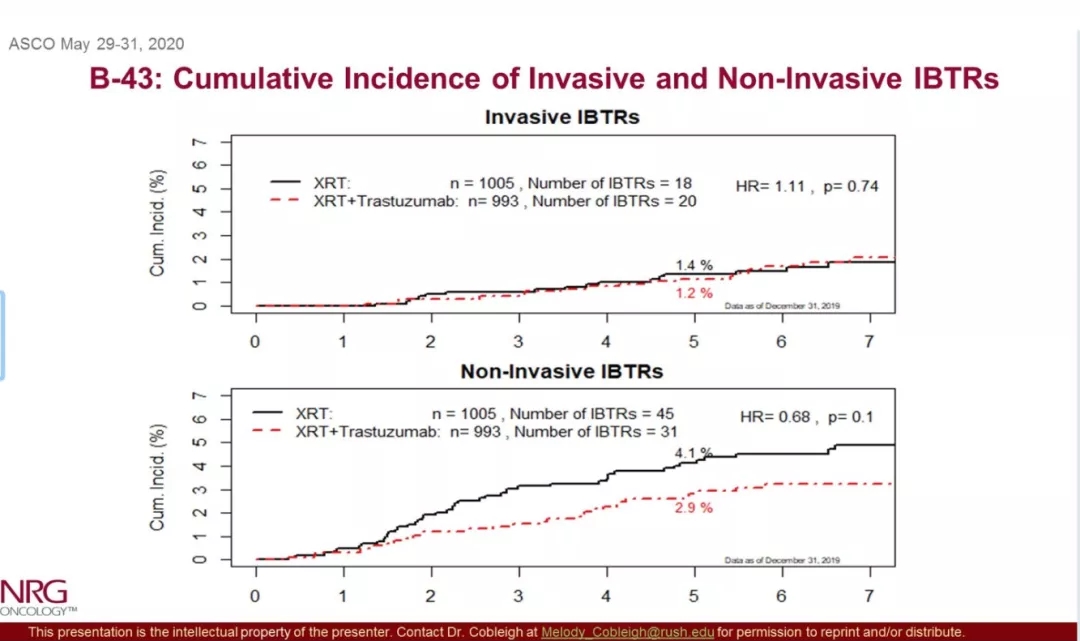 摘要A508还报告了女性HER2阳性DCIS患者肿块切除术后辅助治疗选择常规乳腺放疗基础上加入曲妥珠单抗治疗对比单纯放疗预防同侧乳腺癌、皮肤恶性肿瘤和DCIS等(统称IBTR)发生随机III期临床研究(NRG Oncology / NSABP B-43)。临床前研究已经提示曲妥珠单抗能够增强放疗效果,本研究于2008年11月9日至14年12月8日共2014例患者进入随机,平均随访79.2个月,数据截止至2019年12月31日,单纯放疗组共988 例,放疗联合曲妥珠单抗组977例。