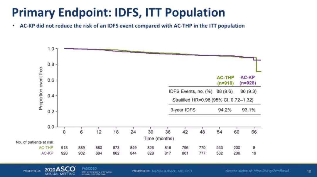 在淋巴结阳性的1658例患者的分析发现,3年的IDFS分别为92.7%对94.1%,ITT人群的IDFS分别为93.1%对94.2%,3/4级毒性反应相近,但是,因为毒性而停药的发生AC-KP组更高(26.8% 对 4.0%)。因此,T-DM1替代紫杉类联合曲妥珠单抗并不会带来显著的疗效和安全性改善,对于高危HER-2阳性早期乳腺癌辅助治疗,妥妥双靶向联合紫杉的方案仍然是标准选择。