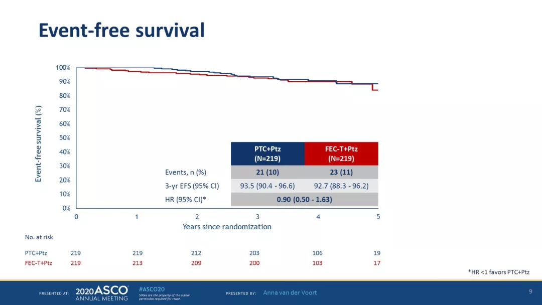 今年ASCO报告其次要终点无事件生存(EFS)和总生存(OS)。在中位随访48.8个月后,含蒽环组和非蒽环组的3年EFS率分别为92.7%和93.6%;3年OS率分别为97.7%和98.2%。且与激素受体和淋巴结转移状态无关。蒽环类药物组还发现2例继发急性白血病的患者。再次证实,以卡铂、紫杉类为基础的联合双靶抗HER2治疗方案是Ⅱ-Ⅲ期乳腺癌的标准新辅助治疗方案。