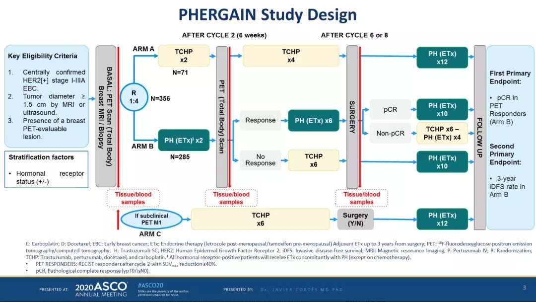 A503摘要报告了三阳性乳腺癌患者通过早期FDG-PET/CT影像评估及病理缓解的综合策略来探索化疗降阶,选择内分泌治疗联合双靶向的新辅助治疗策略。该研究(PHERGain)有3个队列,队列A接受“多西他赛+卡铂+曲妥珠单抗+帕妥珠单抗(TCbHP)”,队列B接受“曲妥珠单抗+帕妥珠单抗±内分泌治疗(HP±ET)”,以上两组以1:4随机分组,所有患者在随机时和治疗2个周期后各评估一次FDG-PET/CT,如果基线检查确认有亚临床转移灶,将其列入队列C。队列A患者需完成6个周期的TCbHP方案治疗。队列B则根据PET评估结果,有响应的患者继续接受“HP±内分泌治疗”6个周期;无响应患者改为接受6个周期TCHP方案治疗,术后如证实队列B未达到pCR患者,需接受6个周期TCHP方案治疗。共同主要终点为队列B中PET缓解患者的乳房/腋窝pCR率和队列B的3年iDFS。