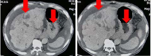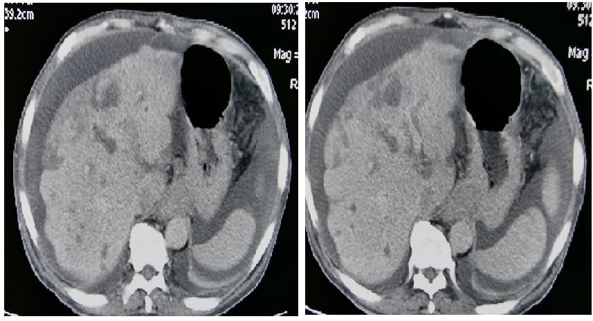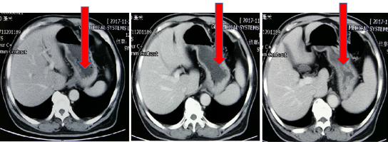 CT(外院2018.05):肝内多发占位,考虑转移;贲门胃底部溃疡性肿物;胃低及胃左动脉多发肿大淋巴结;考虑转移。