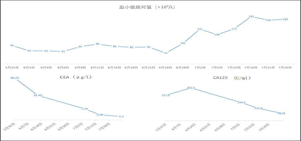 患者体温正常,炎症指标恢复正常;凝血功能恢复正常,血小板及白细胞回升并稳定在正常范围,腹腔积液明显减少,腹胀减轻,恢复排气排便。ECOG:由4分恢复至2分