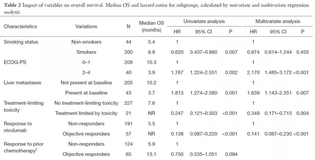 单因素分析显示,以下因素与较好的预后有关:既往有吸烟史,PS评分0-1分,基线无肝转移,接受Nivolumab出现客观反应,以及患者出现治疗相关的安全性事件。其他变量如性别、年龄、肿瘤病理类型以及是否存在脑转移和PFS以及OS并无相关性。进一步分析显示,符合CheckMate-017和057研究纳入标准的患者,与不符合纳入标准的患者,预后不存在差异;接受Nivolumab治疗后,出现客观缓解的患者比未出现客观缓解的患者PFS和OS更好。