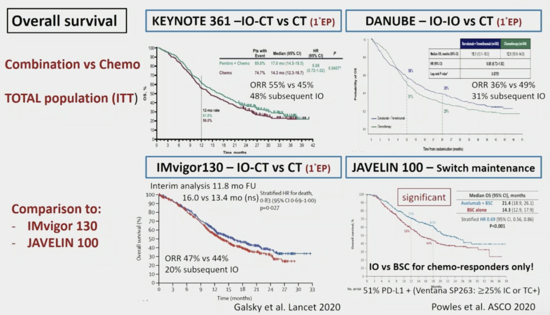 目前,4项有关mUC一线免疫治疗的Ⅲ临床研究已经公布结果,包括KEYNOTE 361、IMvigor130、DANUBE、Javelin Bladder 100。在这四项研究结果中,最为成功的是化疗后免疫维持的Javelin Bladder 100,而一线化疗直接联合免疫的KEYNOTE 361和IMvigor130的研究结果显示联合可能有优势,但获益程度较小,结果差强人意。