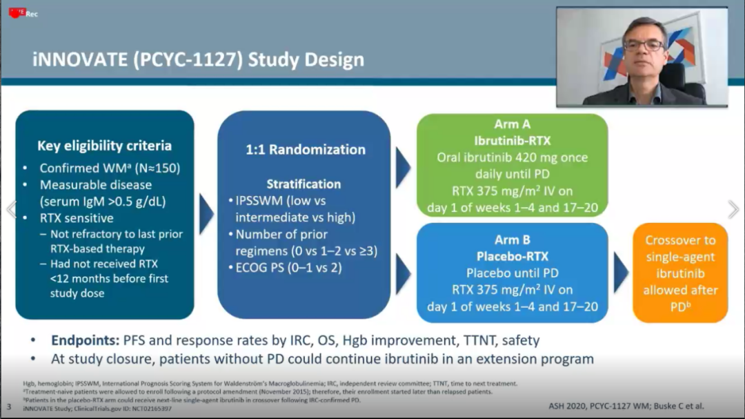 纳入150例华氏巨球蛋白血症(WM)患者,1:1分配至伊布替尼+利妥昔单抗(IR, n=75)或安慰剂+利妥昔单抗(n=75)进行治疗。该研究的主要终点指标包括:无进展生存(PFS)、总体生存(OS)、血红蛋白改善情况、至下次治疗的间隔时间(TTNT)及安全性。