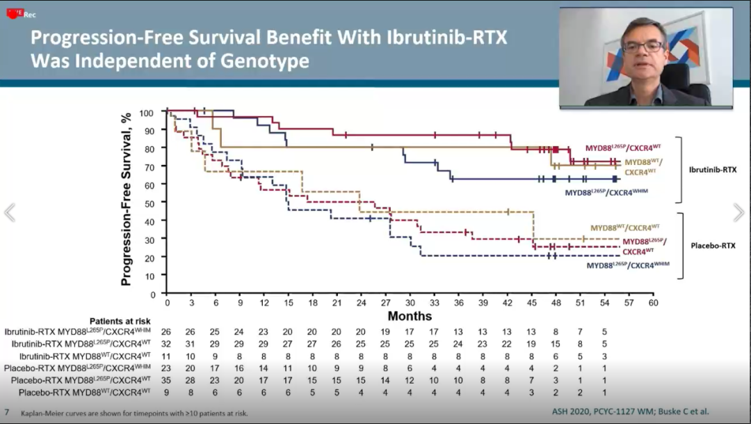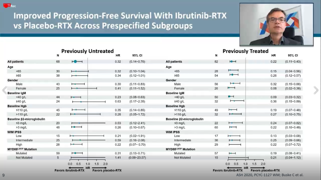 ②无论患者既往接受治疗的情况、基因型(MYD88L265P/CXCR4WT; MYD88L265P/CXCR4WHIM ; MYD88WT/CXCR4WT)及基线特征如何,亚组分析显示,IR方案较之于安慰剂+R方案组而言均能带PFS的优势。