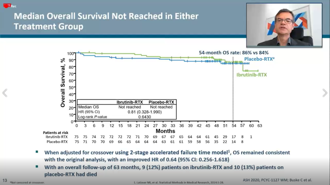 ①在无进展生存(PFS)方面,伊布替尼+利妥昔单抗(IR)方案组的中位PFS尚未达到(NR),安慰剂+利妥昔单抗组的中位PFS为20.3月(HR=0.25,95%CI:0.15~0.42; p<0.0001)。在第54个月时的PFS分别为68%(IR)vs 25%(安慰剂+R)。
