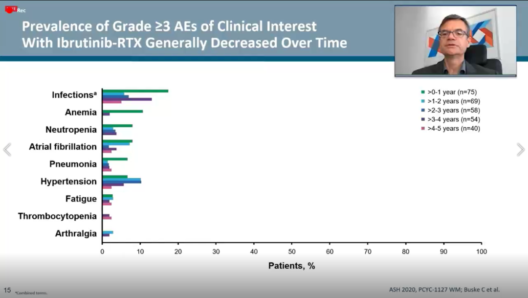 在安全性方面:研究中最常见的3~4级不良事件(AEs)包括房颤(16%)、高血压(15%)、中性粒细胞减少症(13%)、贫血(12%)。需要指出的是,无患者因不良事件导致伊布替尼停药。