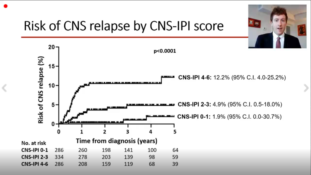 中位随访35.3月,结果显示:①CNS-IPI评分0-1、2~3及4~6的DLBCL患者发生CNS复发的风险依次为1.9%、4.9%和12.2%。