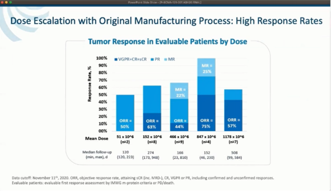 截至2020年6月30日,研究共纳入43例患者接受了P-BCMA-101治疗(男/女:67%/33%,中位年龄60岁)。患者既往曾接受多次治疗方案(中线治疗线数为7[范围:3-18]),100%患者既往接受蛋白酶体抑制剂和IMiD,93%接受达雷木单抗和58%接受自体干细胞移植治疗。这项研究最初是作为一项剂量递增临床试验,在标准淋巴细胞剔除方案之后每例输注0.75-15×106个细胞/kg P-BCMA-101。随后对采用新治疗策略的探索性队列进行评估。采用改进的生产工艺以中位剂量为0.75×106细胞/kg进行给药,包括:以两周为周期的P-BCMA-101输注;在淋巴细胞剔除前后分别给予利妥昔单抗或来那度胺,以防止抗CAR抗体的产生和提高T细胞的活力;以及单次给药。