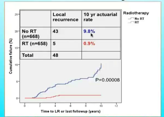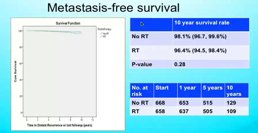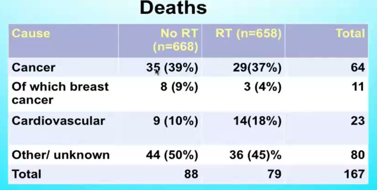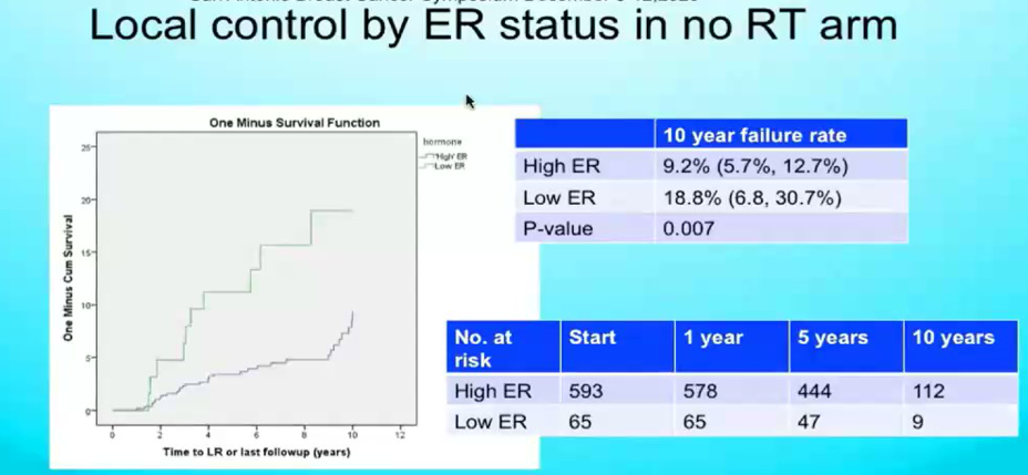 本次大会公布了PRIME2研究随访10年的长期生存结果。结果显示:1.未行辅助放疗组的10年同侧乳房复发率高于接受辅助放疗组(9.8%vs0.9%;P=0.00008);2.未行辅助放疗组的局部复发高于接受辅助放疗组(2.3%vs0.5%;P=0.014);3.两组间的远处复发、对侧乳腺癌、其他部位恶性肿瘤发生率、无远处转移生存及总生存无统计学差异。绝大多数的死亡病例并非因乳腺癌;4.亚组分析显示在未行辅助放疗组中ER高表达患者的同侧乳房复发率低于ER低表达患者(9.2%vs18.8%;P=0.007)