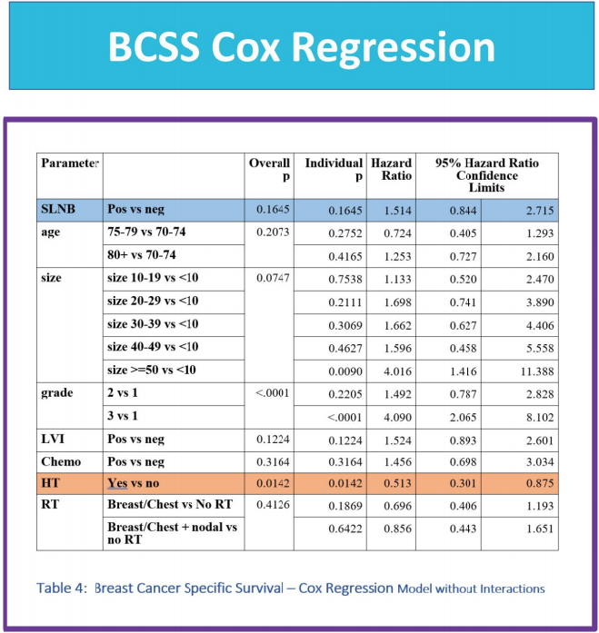 结论:大于70岁ER+老年乳腺癌患者5年生存极好,尽管SLNB会对术后辅助治疗产生决策上的影响,但若术后接受辅助内分泌治疗,对于无乳腺癌事件生存并不会造成影响。所以我们可以对那些ER+低危并预计接受内分泌治疗的老年患者豁免SLNB。