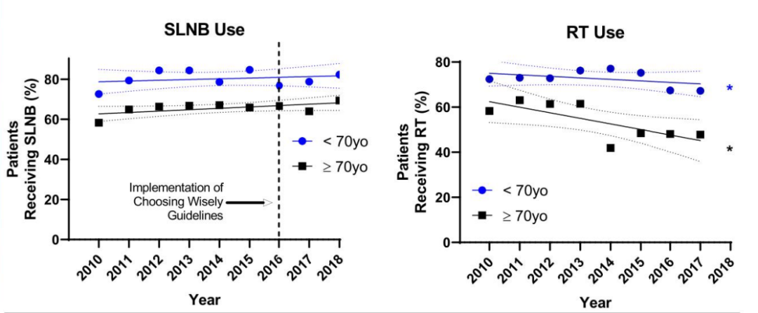 来自美国的研究组也同样注意到2016年SSO协会对70岁以上临床评价淋巴结阴性(cN0)ER+者豁免前哨淋巴结活检(SLNB)的推荐并没有被广泛采用,且这部分患者术后腋窝的放疗比例也很高。通过此研究发现ER+HER2-cLN070岁以上者前哨淋巴结阳性者比率低(11.5%);有无放疗局部复发率相似。建议此类患者可以豁免SLNB及放疗。