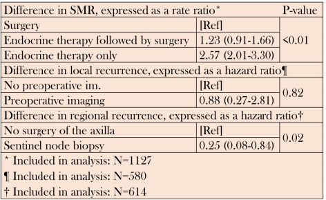 该研究入组了1142名2000年-2007年在丹麦Herlev医院接受治疗的70岁以上早期浸润性乳腺癌女性患者。采用泊松回归分析标准死亡率(SMR)差异,特定风险模型分析局部复发和区域复发。