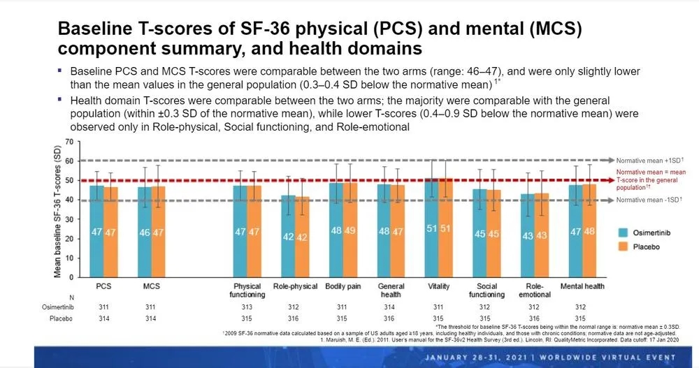 Majem博士展示的数据表明,奥希替尼和安慰剂组的PCS和MCS的T-Score基线相似,均在46~47之间——仅略低于普通人群的平均水平(即50)。两组在8个SF-36健康领域的得分也非常相似。重要的是,数据显示SF-36评分从基线到第96周一直保持不变,两组的PCS、MCS和个人健康领域评分中,没有观察到有临床意义的差异(图1)。