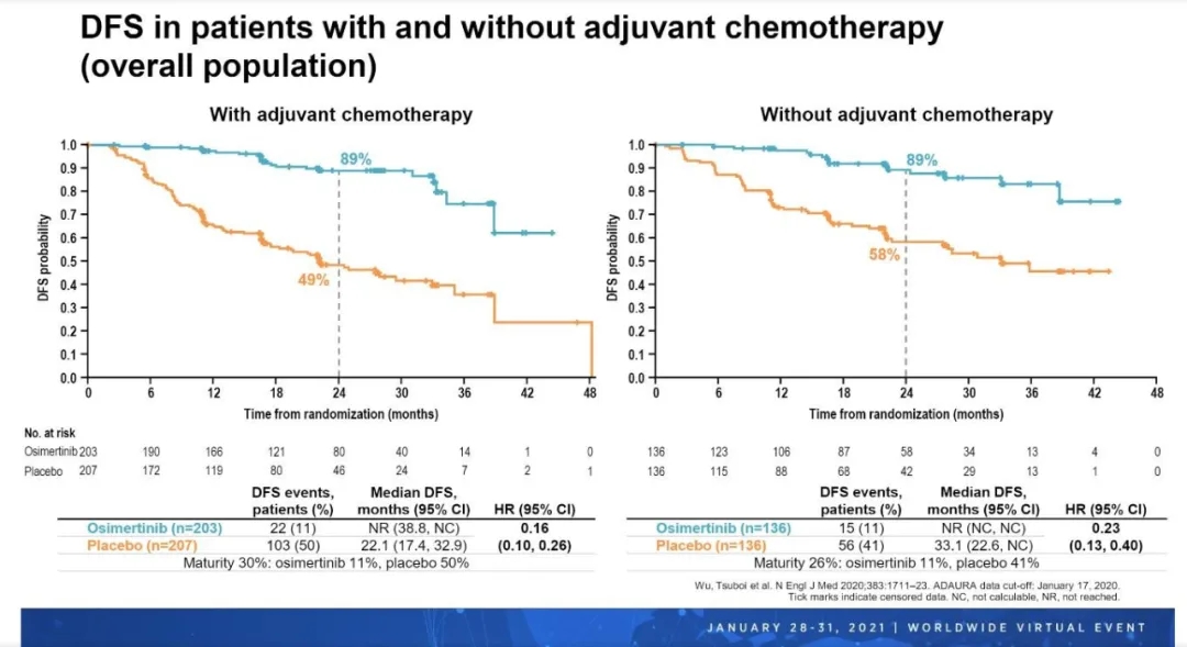 图2. ADAURA研究:辅助化疗和未辅助化疗患者的DFS