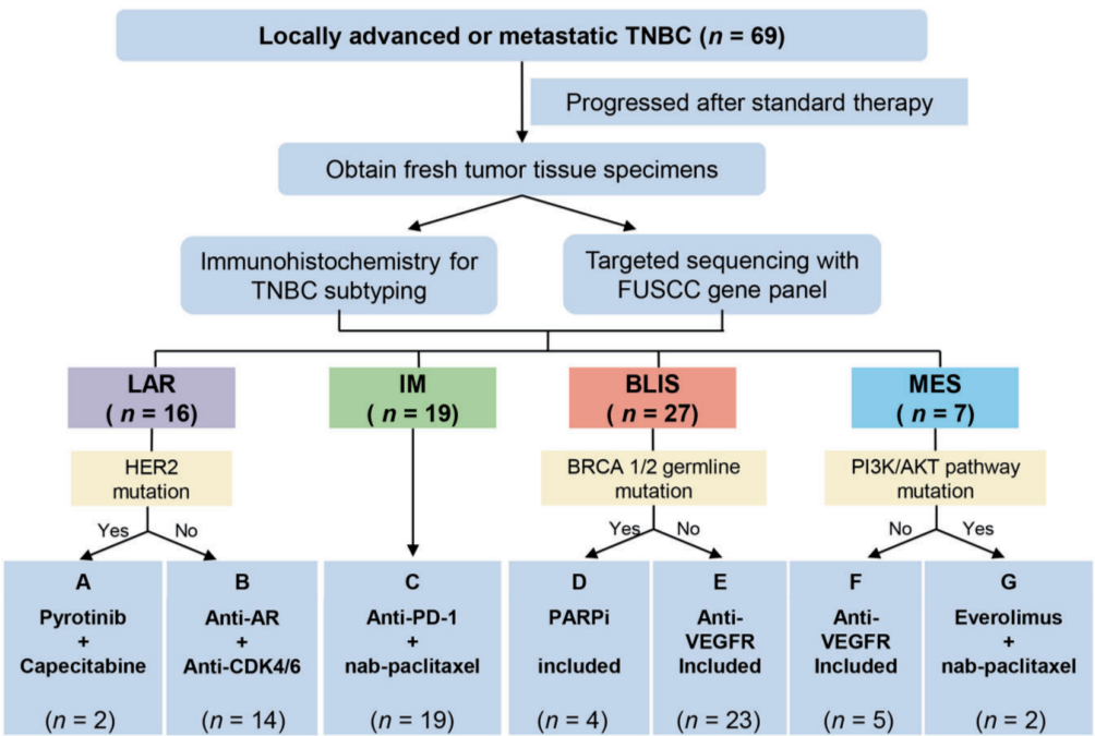 基于精准的“复旦分型”方案,我们了设置FUTURE临床试验,该研究为“伞形”研究,主要针于经过多轮治疗后(入组患者既往中位治疗线数为3)仍然出现进展的三阴性乳腺癌,并根据“复旦分型”分为7个治疗臂,分别给予不同的方案治疗。2020年7月份,FUTURE临床试验结果在Cell Research杂志发表。通过FUTURE研究,我们发现在多线治疗失败的患者中,一些治疗方案疗效显著。如在IM型C臂患者中,采用抗PD-1抗体+白蛋白紫杉醇进行化疗,ORR可高达52.6%。同时,在BLIS型E臂患者中,采用抗血管生成药物,ORR也可达到26.1%。