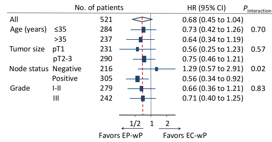 中位随访62个月结果显示,EC-wP与EP-wP相比:1年月经恢复率:48.3% vs. 63.1%(95%CI:42.2%~54.3%、57.2%~68.9%;绝对差异:14.8%,95%CI:6.37%~23.2%,P<0.001);5年无病生存率:78.3% vs. 84.7%(95%CI:72.2%~83.3%、79.3%~88.8%,分层对数秩P=0.07)。4年成功妊娠率:2.7% vs. 9.6%(P=0.03)。