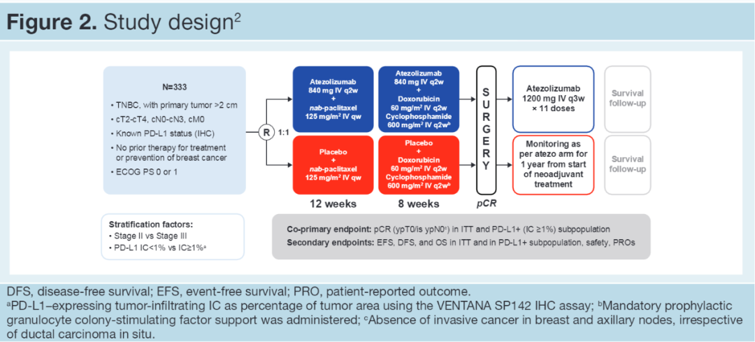 IMpassion 031(NCT03197935)是一项全球多中心、随机、双盲的Ⅲ期临床研究。旨在评估阿替利珠单抗联合化疗在早期TNBC新辅助治疗中的疗效和安全性。患者入组条件为:1.年龄≥18岁;2.入组前未接受治疗;3.Ⅱ-Ⅲ期(cT2-T4d和cN0-N3c);4.浸润性eTNBC(M0)。该研究共入组了333名术前患者并按1:1随机分配至:接受840mg阿替利珠单抗或安慰剂每2周+白蛋白结合型紫杉醇125mg/m2每周,共12周续贯840mg或安慰剂每两周+多柔比星60 mg/m2+环磷酰胺600mg/m2每2周,共8周。