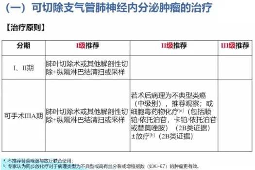 对于IIIA/IIIB期的患者,若是姑息性切除和/或切缘阳性,推荐低级别(典型类癌)患者进行术后观察,也可根据术后情况选择放疗;对于中级别(不典型类癌),术后的治疗应更积极。