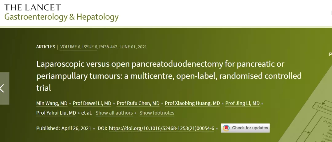 Min Wang, et al. Laparoscopic versus open pancreatoduodenectomy for pancreatic or periampullary tumours: a multicentre, open-label, randomised controlled trial. Lancet Gastroenterol Hepatol. 2021 Apr 26;S2468-1253(21)00054-6.