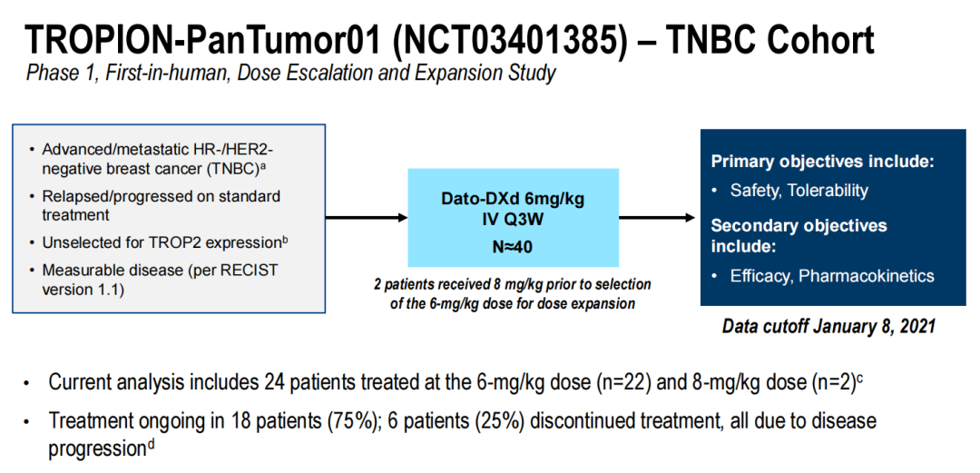 Dato-DXd是一种ADC,由人源化的抗TROP2 IgG1单抗通过稳定的四肽基剪切连接物偶联到有效负载的拓扑异构酶Ⅰ抑制剂(DXd)上。一项正在进行的Ⅰ期TROPION-PanTumor01 (NCT03401385)研究显示,Dato-DXd在经过大量治疗的转移性NSCLC患者(pts)中具有令人鼓舞的抗肿瘤活性。这里报道的是mTNBC的初步结果;该研究的招募正在进行中。