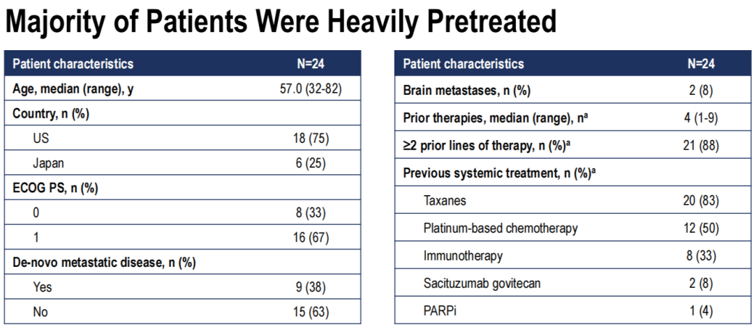 在三阴性乳腺癌的研究中(注册号:NCT03401385),具体纳入标准如下:1.晚期/转移性HR-/HER2-乳腺癌(TNBC);标准治疗后复发/进展;不区分TROP2表达;有可测量的病灶(根据RECIST 1.1 版本)。具体用量:DS-1062,6mg/kg(其中2例患者接受8mg /kg→6mg /kg),d21。预计共纳入n=40例。主要研究终点:安全性和耐受性;次要研究终点:有效性和药代动力学。研究截止日期:2021年1月8日,共纳入分析包括:24例,接受6mg/kg的患者(n=22)和接受8mg/kg的患者(n=2)。18例(75%)继续治疗中,6例(25%)因疾病进展脱落。